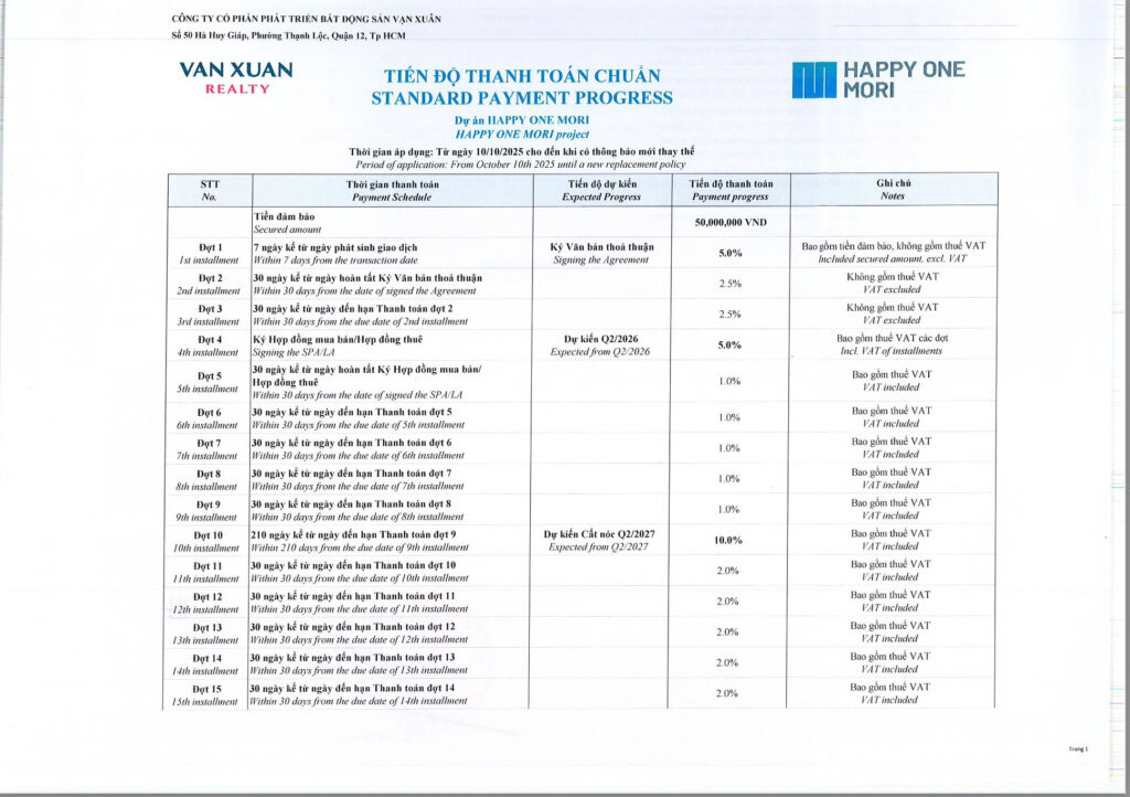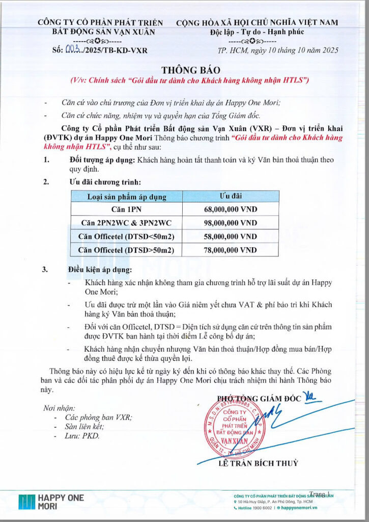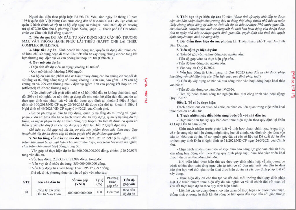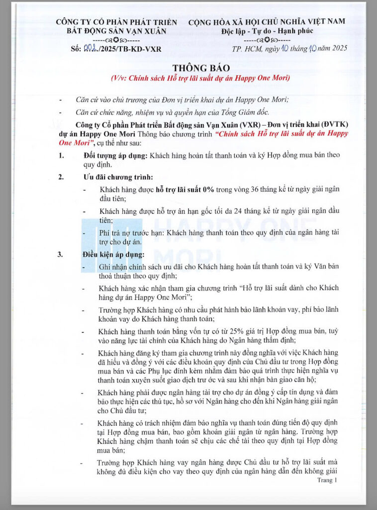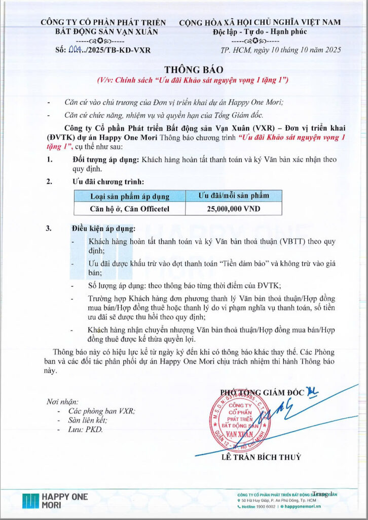 Dự án Happy One Mori là dự án thứ 8 của Tập Đoàn Vạn Xuân Group. Dự án có quy mô hơn 1.100 căn hộ được cao cấp toạ lạc tại đường Lái Thiêu 14, Phường Lái Thiêu, TP Hồ Chí Minh. Hứa hẹn đây sẽ trở thành điểm đến lý tưởng cho những ai khao khát một không gian sống hiện đại, đầy cảm hứng.Theo định hướng phát triển một cộng đồng cư dân tri thức, có phong cách sống hiện đại và văn minh, Happy One Mori được tích hợp hệ thống tiện ích đa dạng, nổi bật với không gian cảnh quan xanh mát, khu sinh hoạt cộng đồng, khu thể thao, hồ bơi gia nhiệt, khu chiếu phim, khu vui chơi trẻ em,… đáp ứng toàn diện nhu cầu sống – thư giãn – kết nối của cư dân