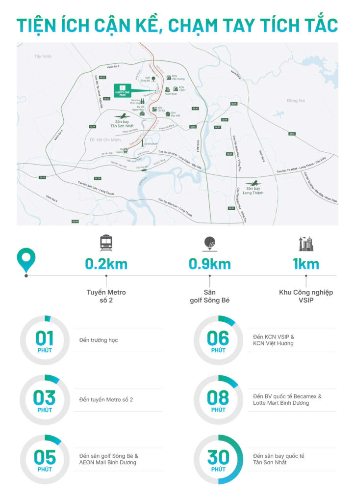 Nằm giữa trung tâm kết nối 10+ KCN, Happy One Mori với 1.441 sản phẩm đa dạng loại hình: Căn hộ, Officetel và Thương mại dịch vụ, đáp ứng nhu cầu an cư của giới chuyên gia, kỹ thuật viên, doanh nhân, thương gia, người trẻ thành công sớm… phía Bắc TP.HCM – Thủ phủ công nghiệp với tốc độ phát triển hạ tầng, văn hóa xã hội sôi động bậc nhất thành phố.